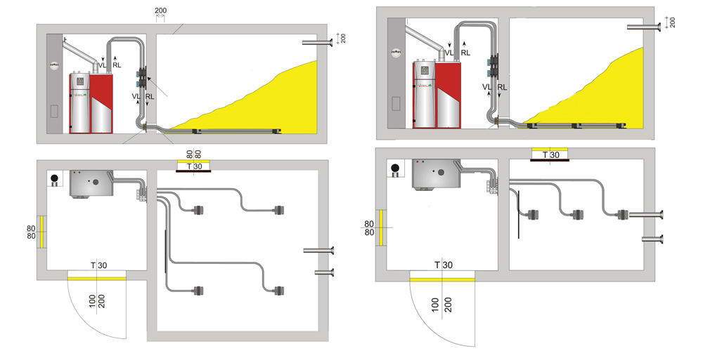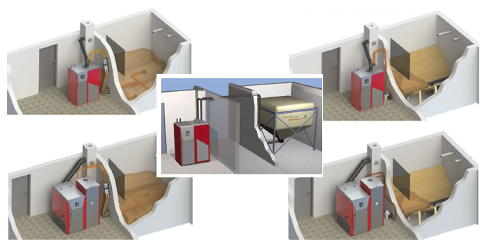 Wood pellets are delivered into the biomass boiler by vacuum tube with lengths of 800-1,200mm. The fuel store for wood pellets can be integrated onto the boiler, custom-built, prefabricated or constructed underground.